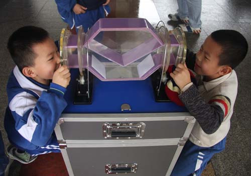 旋轉(zhuǎn)鏡是由三塊平面鏡按一定角度組合而成的。當(dāng)鏡筒旋轉(zhuǎn)時(shí),三塊鏡子同步轉(zhuǎn)動(dòng)。盡管觀(guān)眾的頭部沒(méi)動(dòng),但鏡子對(duì)物體同一點(diǎn)上入射光的反射位置起了變化,所以觀(guān)眾看到對(duì)方的影像隨著轉(zhuǎn)角不同而不斷旋轉(zhuǎn)。